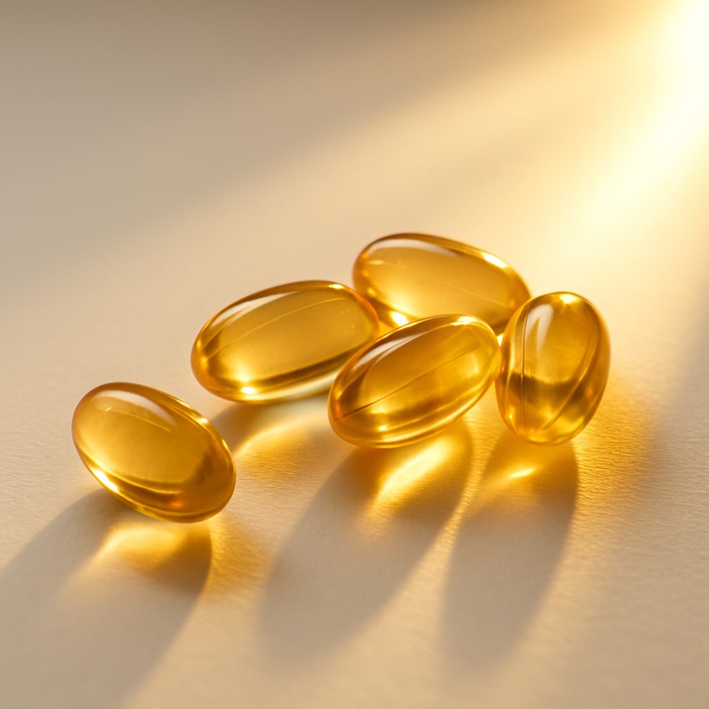 Vitamin D3 supplements in sunlight representing mood and mental health benefits